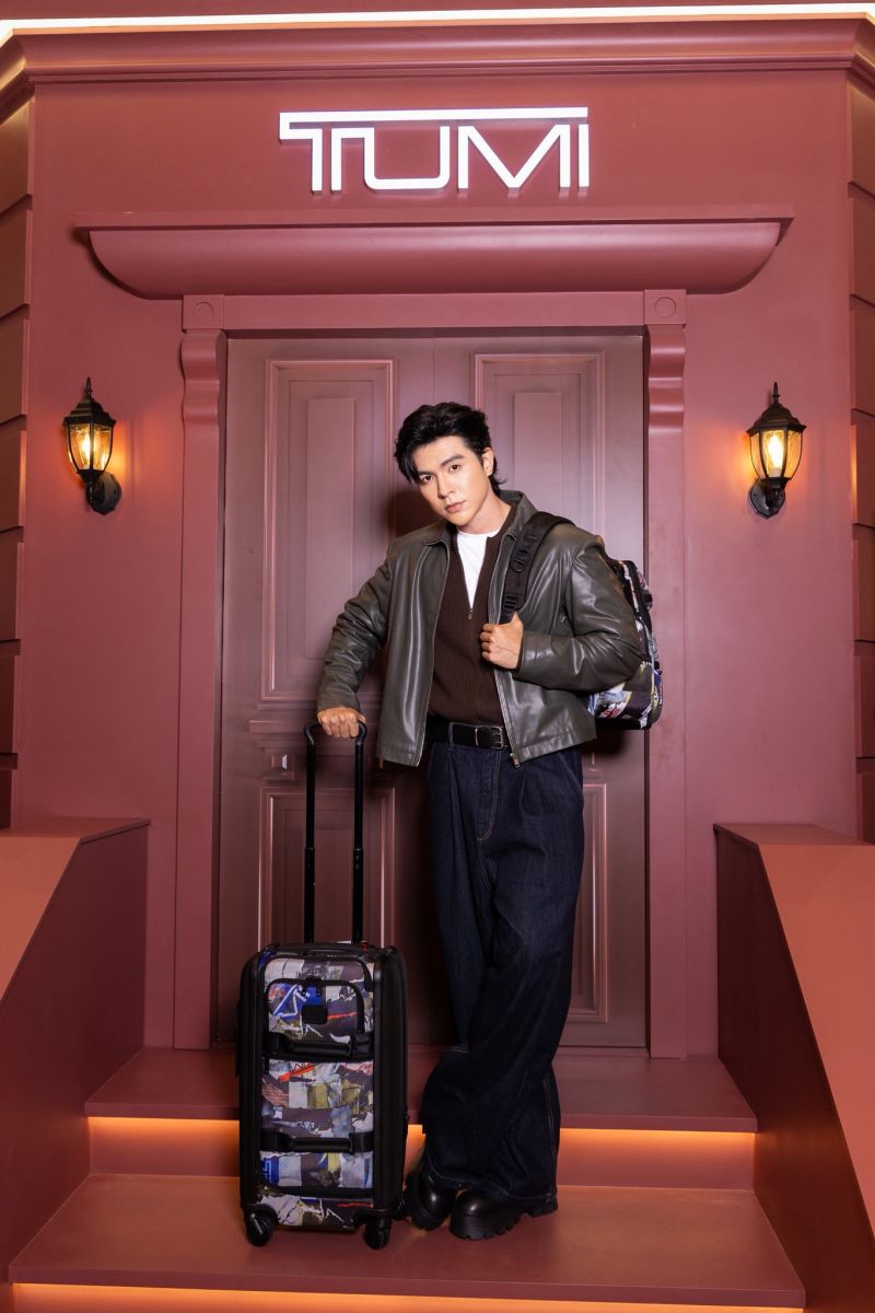 Steven Nguyễn xuất hiện lịch lãm với áo khoác da cá tính kết hợp quần jean năng động. Hình ảnh anh tạo dáng cùng vali và balo phiên bản họa tiết mới của TUMI mang đến cảm giác trưởng thành, mạnh mẽ nhưng vẫn gần gũi.